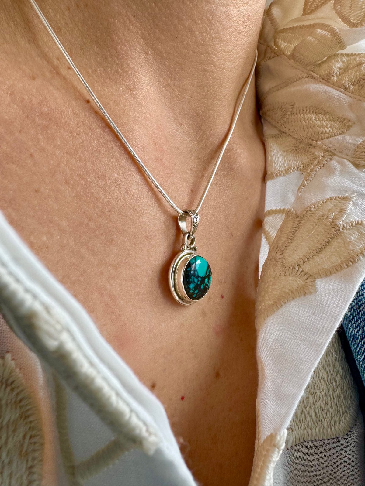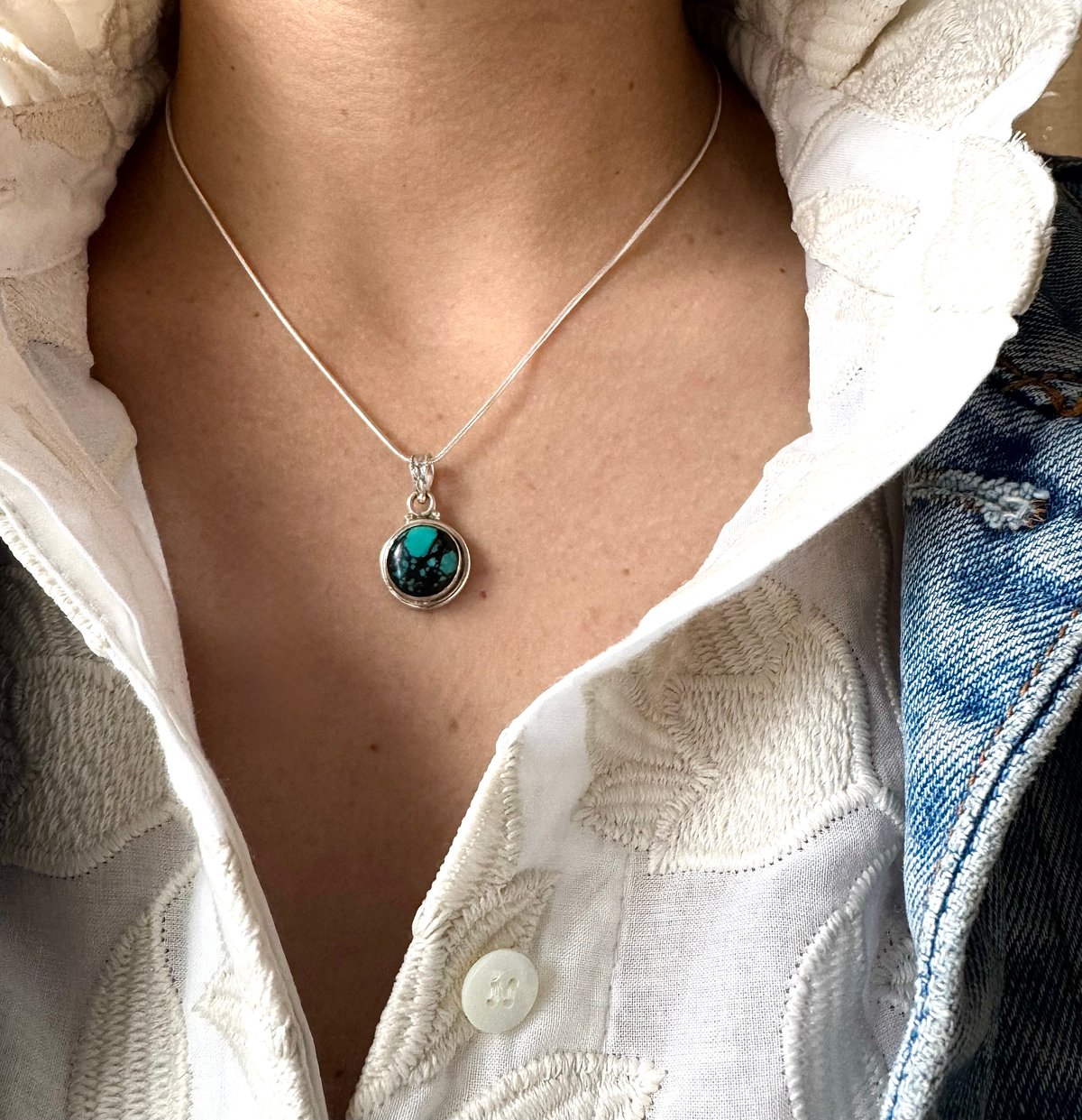 Pendentif en argent massif et pierre turquoise du Tibet naturelle.