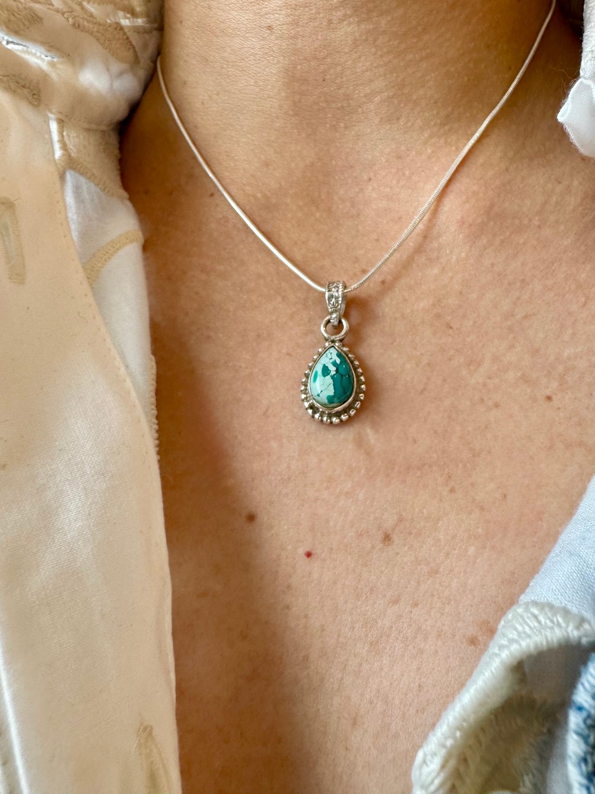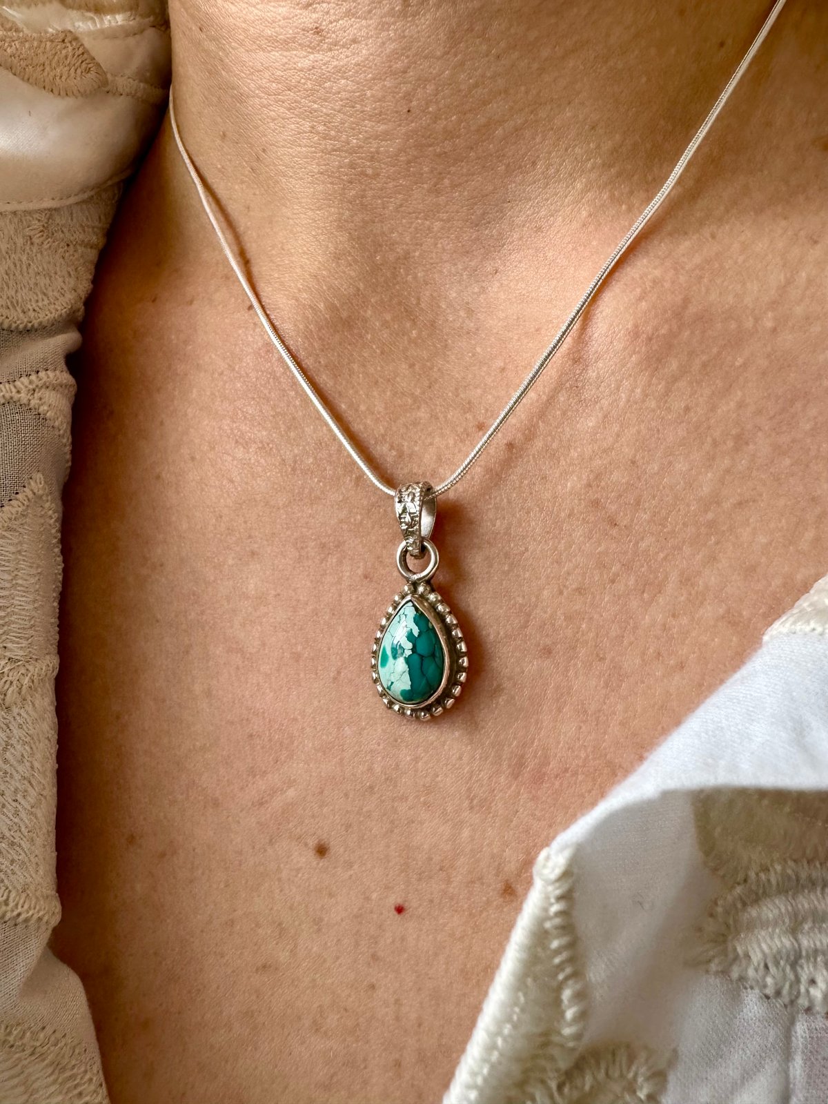 Pendentif en argent massif et pierre turquoise du Tibet naturelle.